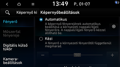 Automatikus fényerő (ha felszerelt): Automatikusan, a külső fényerőnek megfelelően beállítja a képernyő fényerejét.