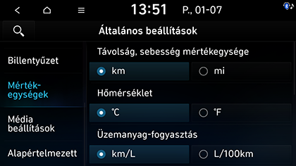Ez a menü a rendszerben használt egységek konfigurálására szolgál.