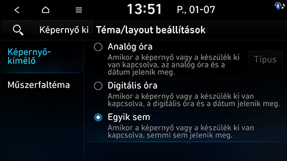 Képernyő- kímélő: Kiválasztja a képernyővédőt. Kiválaszthatja az Analóg óra, Digitális óra vagy a Egyik sem lehetőséget a képernyővédő megjelenítéséhez.