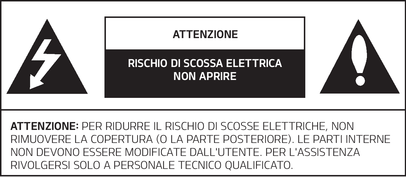 Per ridurre il rischio di scosse elettriche, non rimuovere la copertura o la parte posteriore del prodotto. All'interno non sono presenti parti aggiustabili dall'utente. Per l'assistenza rivolgersi solo a personale tecnico qualificato.