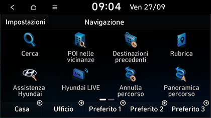 Destinaz.: Cerca i servizi Hyundai in prossimità della destinazione corrente. Disponibile solo quando è impostata la destinazione.