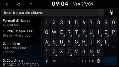 Inserire una parola chiave come un POI, una categoria di POI, un indirizzo o coordinate, e premere OK.