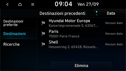 Premere Elimina per eliminare le destinazioni precedenti. Selezionare l'elemento desiderato, quindi premere Elimina.
