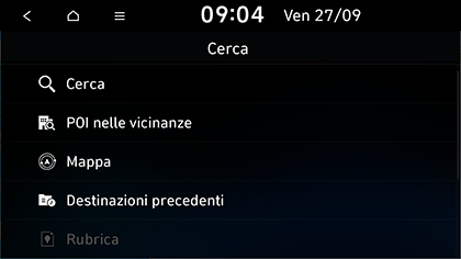 È possibile trovare la destinazione usando vari menu. Alcuni menu sono disponibili solo quando il sistema di navigazione è connesso alla rete di telefonia mobile. Alcuni elementi delle immagini potrebbero differire dalle schermate effettive a seconda del modello, dell'opzione e del paese.