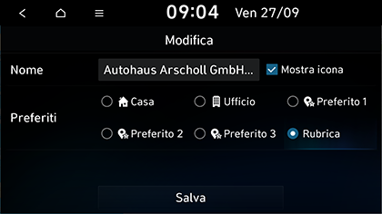 Premere NAV > Rubrica > Preferiti e la voce desiderata per salvare la posizione. Oppure premere NAV > Rubrica > Rubrica > Aggiungi.