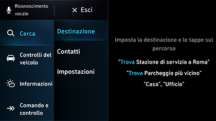 Quando vengono visualizzati i risultati di Composizione o Destinazione, questo comando consente di cercare manualmente invece di usare un comando vocale. Quando si usa questo comando, il riconoscimento vocale viene interrotto. |