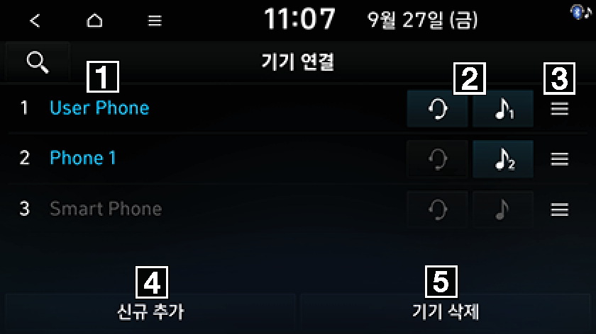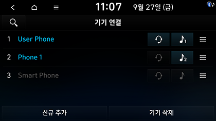 등록된 블루투스 기기 목록을 표시합니다. 목록에서 선택하면 장치가 연결되거나 연결 해제됩니다.