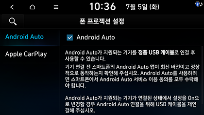 이 메뉴에서, Android Auto 및 Apple CarPlay는 체크마크를 설정하여 활성화할 수 있습니다.