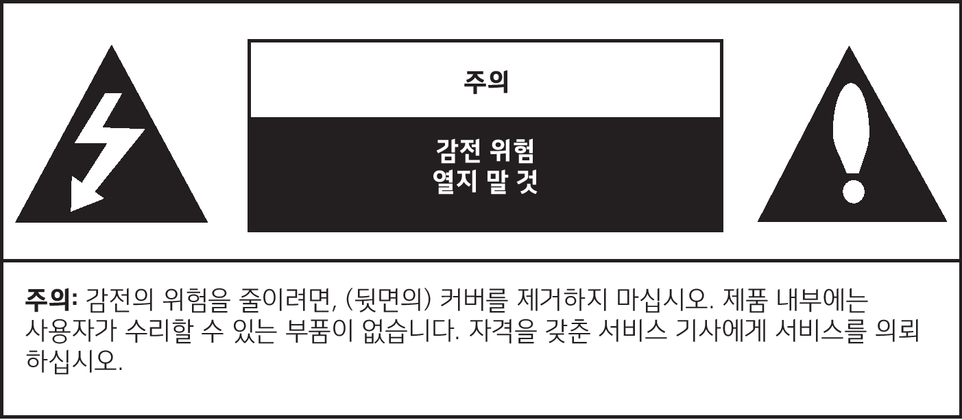 감전의 위험을 줄이려면 이 제품 뒷면의 커버를 제거하지 마십시오. 제품 내부에는 사용자가 수리할 수 있는 부품이 없습니다. 자격을 갖춘 서비스 기사에게 서비스를 의뢰하십시오.