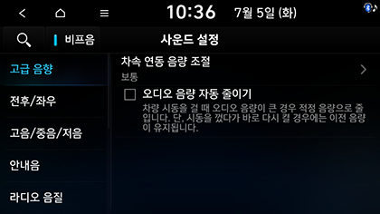 차속 연동 음량 조절: 차량 속도에 따라 오디오 음량을 자동으로 조절합니다.