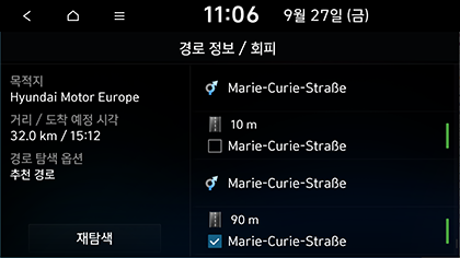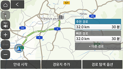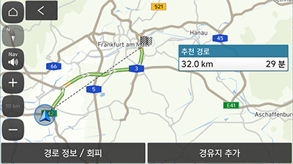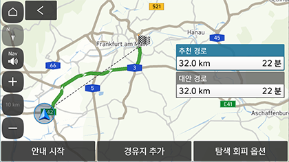 이 기능으로 다음 안내 지점까지의 거리와 그 안내 지점에서 전환할 방향을 볼 수 있습니다. 또한 교통량에 따라 특정 거리를 회피할 수도 있습니다. 차량의 위치에서 목적지까지의 다른 경로를 산출할 수 있습니다.