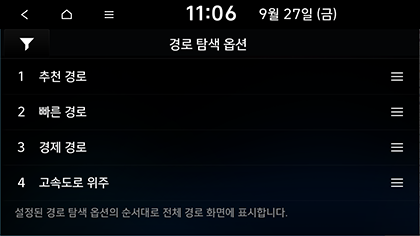 사용자의 필요에 따라 다양한 경로 옵션을 수정할 수 있습니다. 경로 탐색 옵션은 목적지를 설정한 경우에만 제공되는 기능입니다.