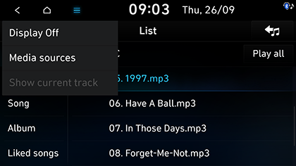 Ekrāns tiek pārvietots uz pašlaik atskaņoto failu sarakstu.