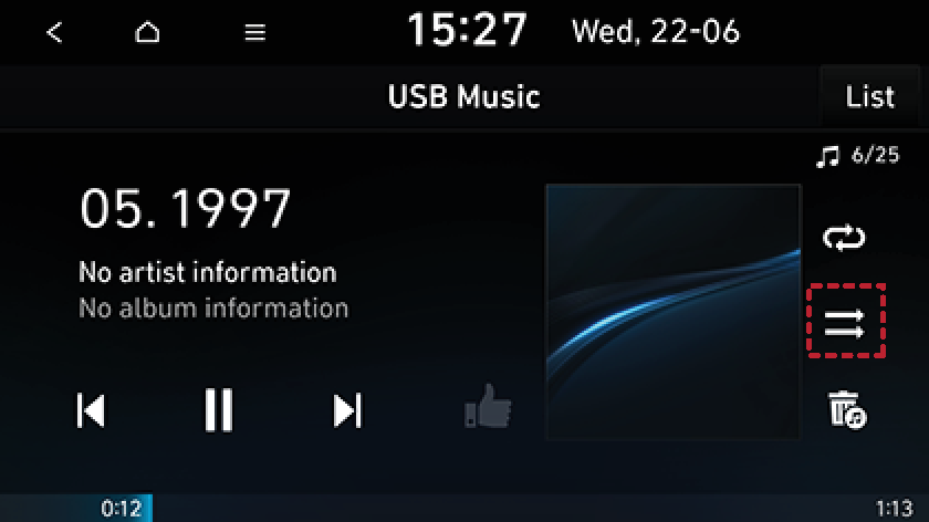 ]: Atskaņo failus secīgi sadaļā Artist, Song, Album vai Liked songs.