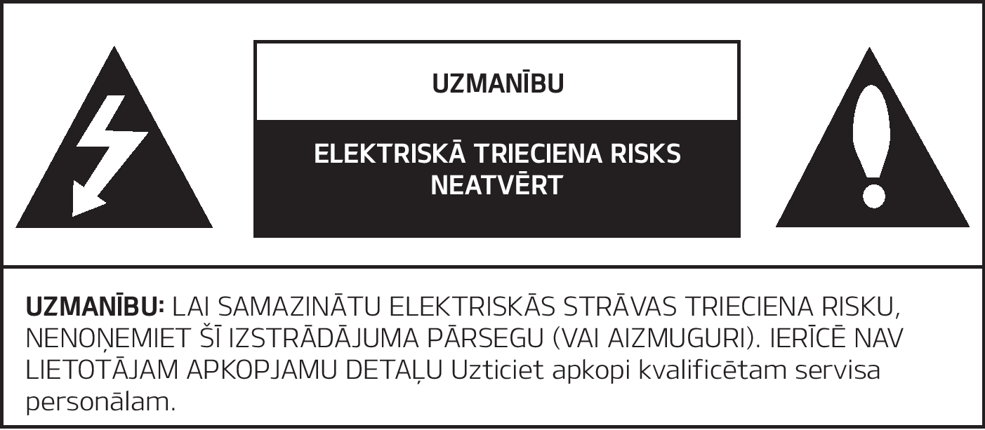 Lai samazinātu elektriskās strāvas trieciena risku, nenoņemiet šī izstrādājuma pārsegu vai aizmuguri. Ierīcē nav lietotājam apkopjamu detaļu. Uzticiet apkopi kvalificētam servisa personālam.