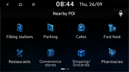 Destination: meklē POI pašreizējā galamērķa tuvumā. Pieejams tikai tad, ja ir iestatīts galamērķis.