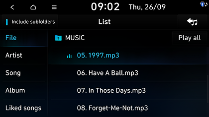 Kategorijas galima rūšiuoti pagal File, Artist, Song, Album arba Liked songs.