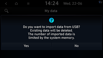 Paspauskite SETUP > Navigation > Automated features> My data > Import favourites and previous destinations from USB.