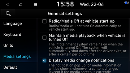 Radio/Media Off at vehicle start-up: Radio/Medie ginn ausgeschalt, wann d’Gefier ausgeschalt gëtt, a se ginn nom Neistart vum Gefier net nees gestart.