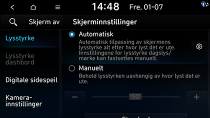 Digitale sidespeil (utstyrsavhengig): Stiller inn lysstyrken på de digitale sidespeilene til sjåføren og passasjeren.