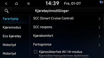 Kjørekomfort: Stiller inn kjøreassistansesystemets egenskaper. Sjekk enhetene du ønsker å innstille.