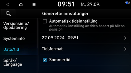 • Automatisk tidsinnstilling (utstyrsavhengig): Stiller automatisk inn klokkeslettet basert på bilens aktuelle posisjon.