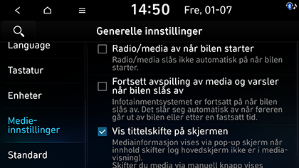 • Vis tittelskifte på skjermen: Varslingsvinduet for medieinformasjon vises ved endring av et innhold (unntatt hvis medieskjermen vises eller ikke.) Ved endring av spor ved å trykke på hardtasten, vil medieinformasjonen vises alltid.