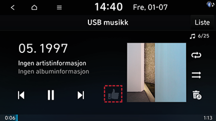 ] > Mediakilder > USB musikk eller bytt via MODE-knappen på rattet. -