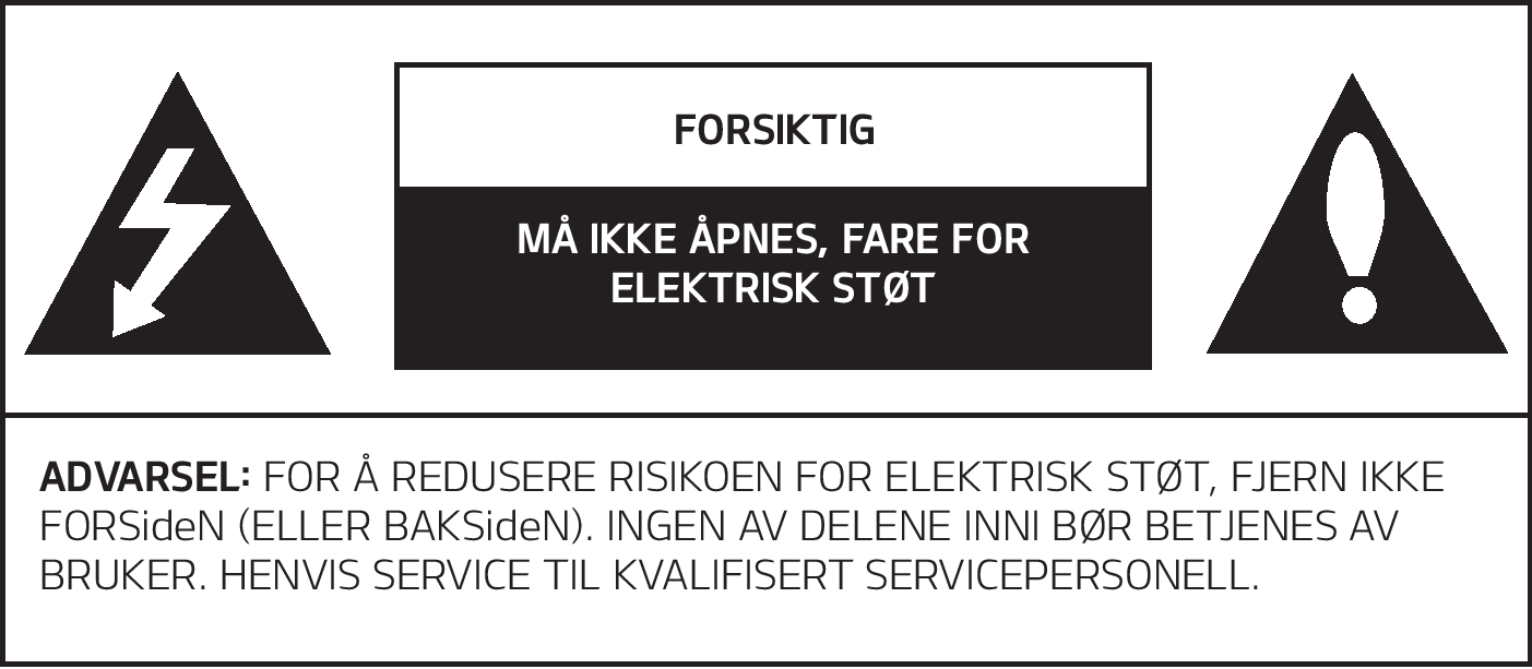 For å redusere risikoen for elektrisk støt, må du ikke fjerne forsiden eller baksiden på dette produktet. Det er ingen deler inni som brukeren selv kan utføre service på. La kvalifisert servicepersonell utføre all service.