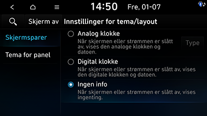 Skjermsparer: Velger en skjermsparer. Velg Analog klokke, Digital klokke eller Ingen info for skjermsparer.