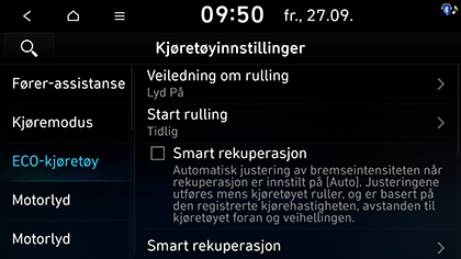 Veiledning om rulling: Kystfartveiledningen hjelper føreren med å spare drivstoff ved å anbefale når han skal fjerne foten fra gasspedalen. Du kan velge Lyd På eller Lyd Av.