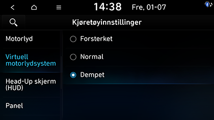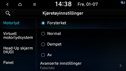 Velg de ønskede elementene. Du kan stille inn motorlydmodus til Forsterket, Normal, Dempet eller Av.