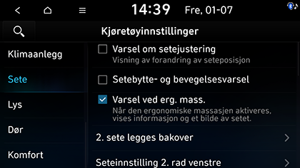 Setevarme/seteventilasjon basert på klimainnstillingene: Setevarme og ventilasjon og rattoppvarming vil aktiveres automatisk for å opprettholde førerkomforten. Sjekk enhetene du ønsker å innstille.