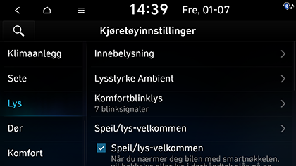 Speil/lys-velkommen: Konfigurerer betingelsen om at velkomstspeil og lys aktiveres.