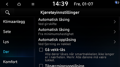 Automatisk opplåsing: Innstiller alle dørene til å låses automatisk. Du kan velge Ved fjerning av nøkkel, Når det skiftes til P-gir, Når kjøretøyet Av, eller Av.