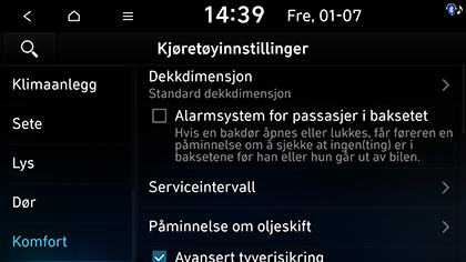 Komfort setetilgang: Velger setets bevegelsesavstand når føreren setter seg inn i kjøretøyet eller forlater kjøretøyet. Du kan velge Maksimal, Normal eller Av.