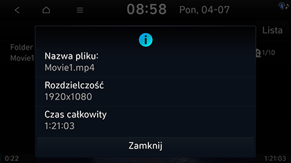 Ta funkcja pokazuje nazwę, rozdzielczość i czas odtwarzania danego pliku.