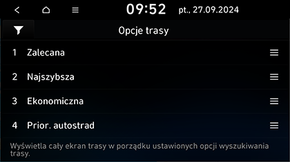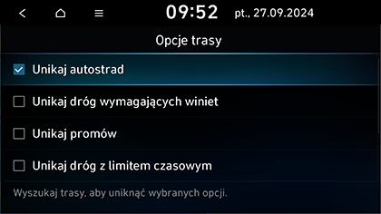 W zależności od potrzeb można modyfikować różne opcje trasy. Upewnij się, że system jest podłączony do sieci. Opcja Opcje trasy jest dostępna tylko wtedy, gdy został ustawiony cel podróży.