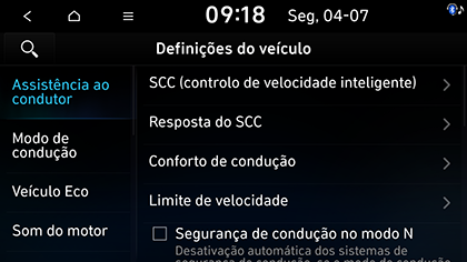 SCC (controlo de velocidade inteligente) (se equipado): define as propriedades do sistema SCC (controlo de velocidade inteligente).