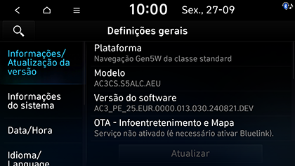 Pode visualizar a versão do software, versão do firmware, versão da aplicação de navegação, versão do mapa e ID do dispositivo.
