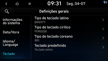 Teclado predefinido: seleciona Tipo de teclado latino, Tipo de teclado cirílico, Teclado grego ou Tipo de teclado coreano.