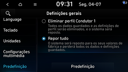 Pode repor o perfil atual ou todo o sistema. Selecione o item pretendido e prima Predefinição > Sim.