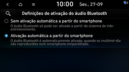 Pode definir o modo Áudio Bluetooth para se ativar automaticamente quando o telemóvel ligado reproduz áudio. Mesmo quando o outro modo está ativado ou todos os modos multimédia estão desligados, se reproduzir Áudio Bluetooth no seu telemóvel, o modo Multimédia muda automaticamente para o modo Áudio Bluetooth para que possa controlar a reprodução no telemóvel. Certifique-se de que o seu telemóvel está emparelhado e ligado ao sistema de infoentretenimento antes de definir.