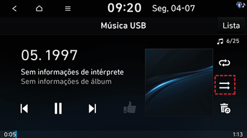• []: reproduz os ficheiros sequencialmente em Intérprete, Música, Álbum ou Preferidos.