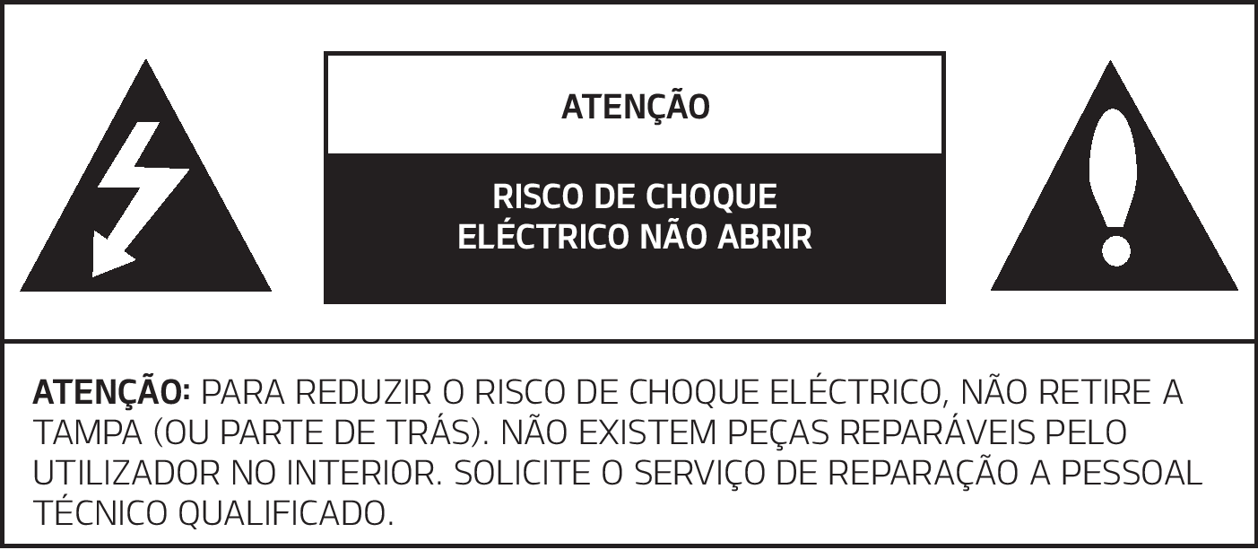 Para reduzir o risco de choque elétrico, não remova a capa ou contracapa deste produto. Não existem peças reparáveis pelo utilizador no interior. Solicite o serviço de reparação a pessoal técnico qualificado.