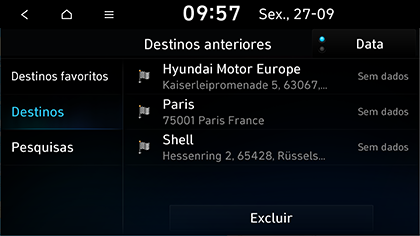 Prima Excluir para eliminar os destinos anteriores. Selecione o item pretendido e, de seguida, prima Excluir.