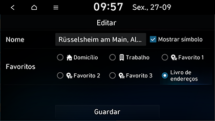 Prima NAV > Locais guardados > Favoritos e o item pretendido para guardar a localização. Ou prima NAV > Locais guardados > Locais guardados > Adicionar.