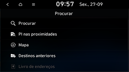 Pode encontrar o destino utilizando diversos menus. Alguns menus apenas estão disponíveis quando o sistema de navegação estiver ligado à rede do seu telemóvel. Alguns itens nas imagens poderão diferir do ecrã real, de acordo com o modelo, opção e país.