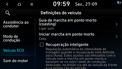 Guia de marcha em ponto-morto (coasting): a orientação em desaceleração ajuda o condutor a poupar combustível recomendando quando remover o pé do pedal do acelerador. Pode selecionar Ligar som ou Desligar som.