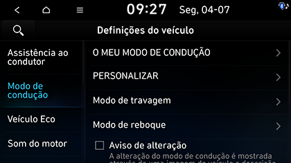 Pode alterar as definições do modo de condução. Em alguns veículos, é apresentado como Modo Condução / Terreno. Algumas funções e imagens poderão diferir do produto real, de acordo com o modelo, opção e país.